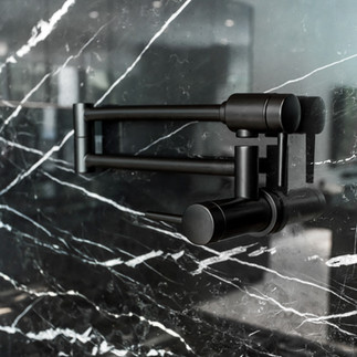 All the plumbing fixtures such as the Sinks, Faucets, and Pot filler in matte black.